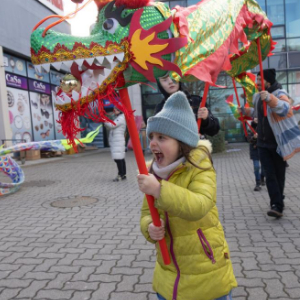 2月3日,在匈牙利布达佩斯唐人街新春庙会上,一名男孩体验舞龙。新华社发(弗尔季·奥蒂洛摄)