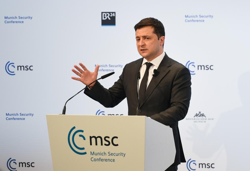 2022年2月19日,在德国慕尼黑,乌克兰总统泽连斯基在第58届慕尼黑安全会议(慕安会)上发言。新华社记者 逯阳 摄