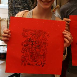 2月3日,在美国纽约大都会艺术博物馆,参观者展示自己制作的木版年画作品。
