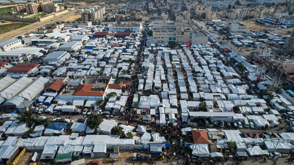 这是2023年11月28日在加沙地带南部城市汗尤尼斯拍摄的一处临时难民营(无人机照片)。新华社发(里泽克·阿卜杜勒贾瓦德摄)