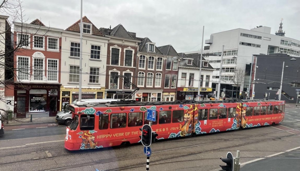 随着中国龙年春节临近,海牙市1号有轨电车披上了以中国红为基调的新衣,车身上展示着“2024欢乐春节”吉祥龙和“你好!中国”熊猫图案,为海牙市民带来浓厚的中国新年祝福。