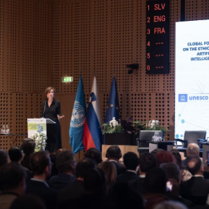 2月5日,联合国教科文组织总干事阿祖莱在斯洛文尼亚克拉尼举行的第二届全球人工智能伦理论坛上发表演讲。