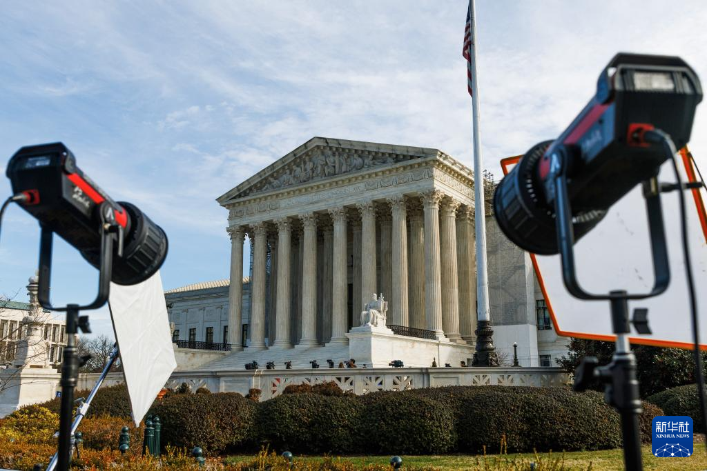 2月8日,媒体拍摄采访设备架设在美国首都华盛顿的美国联邦最高法院外。新华社发(亚伦 摄)