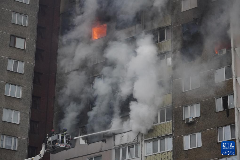 2月7日,消防员在乌克兰基辅为被导弹碎片击中的居民楼灭火。新华社发(罗曼·佩图什科夫摄)