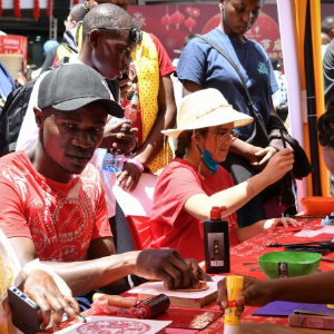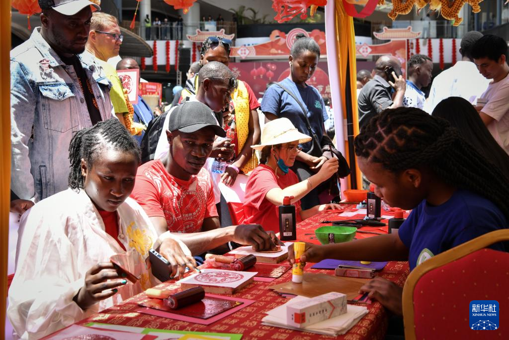 2月10日,在肯尼亚首都内罗毕,人们在内罗毕中国春节庙会上体验中国书法和木版年画。新华社记者 韩旭 摄
