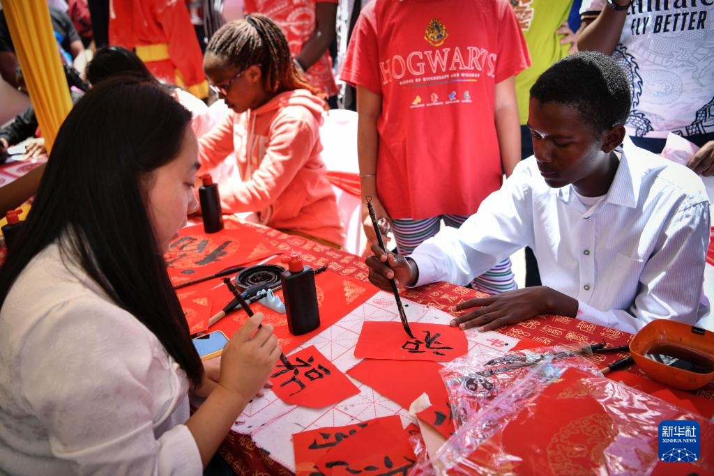 2月10日,在肯尼亚首都内罗毕,人们在内罗毕中国春节庙会上体验中国书法。新华社记者 韩旭 摄pagebreak