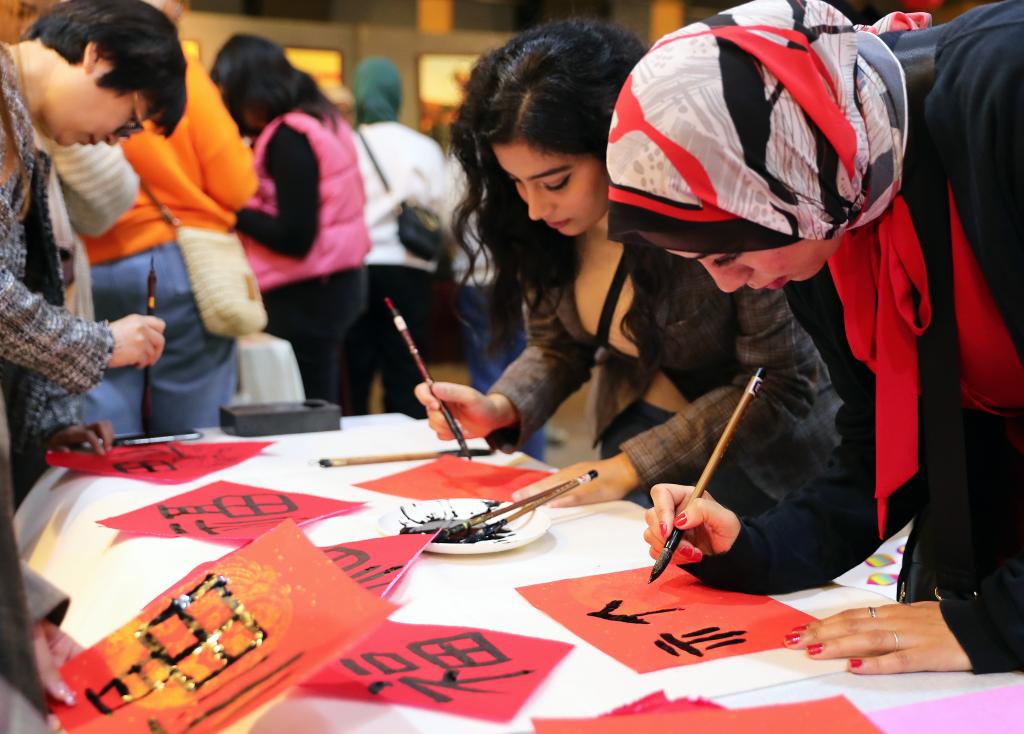 1月25日,埃及女孩在开罗中国文化中心学习写福字。当日,开罗中国文化中心举办2024中国春节文化体验活动,迎接即将到来的中国农历龙年春节。(新华社记者王东震摄)