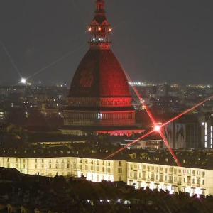2月10日晚,意大利都灵的地标性建筑安托内利尖塔点亮“中国红”和“福” 字,庆祝中国春节。
