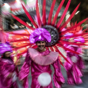 2月14日凌晨,在巴西贝洛奥里藏特,“城市花园”舞校“十二生肖”方阵的演员参加狂欢节游行。