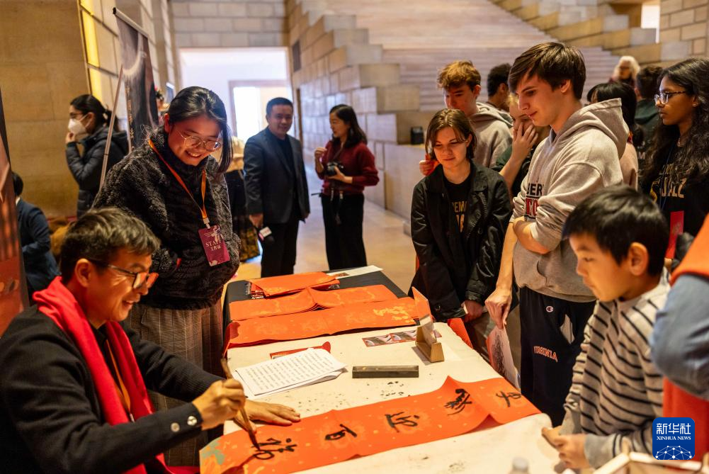 2月11日,书法家在美国费城艺术博物馆举行的龙年迎新春活动上为参观者书写对联。新华社发(周焕新摄)pagebreak