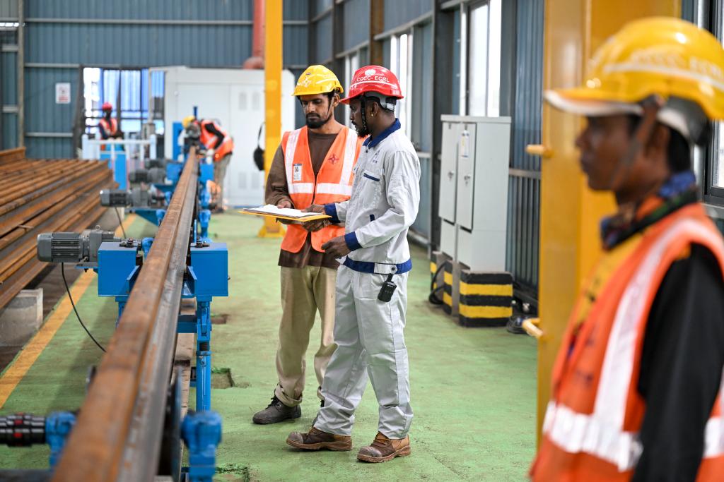 2023年11月19日,在马来西亚关丹市郊的马东铁项目焊轨场,工作人员在车间内交谈。新华社记者程一恒摄