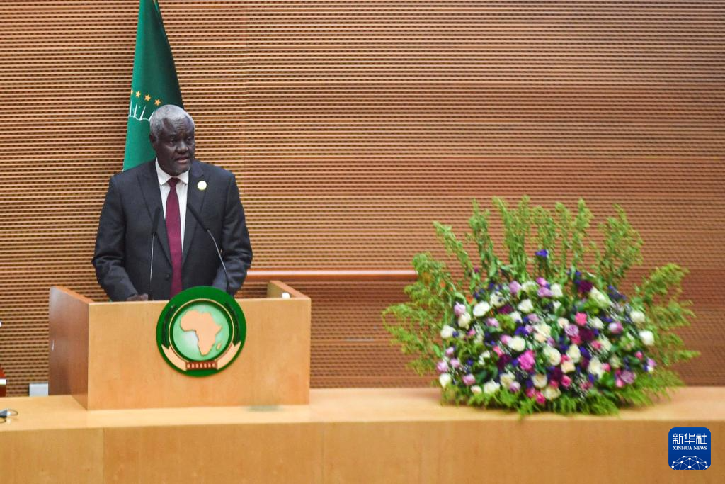 2月17日,在埃塞俄比亚首都亚的斯亚贝巴,非盟委员会主席法基在开幕式上发言。