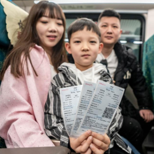 2月14日,在云南昆明,乘坐中老铁路国际旅客列车前往老挝的游客展示购买到的车票。