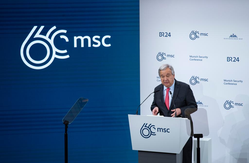 2月16日,在德国慕尼黑,联合国秘书长古特雷斯在第60届慕尼黑安全会议(慕安会)开幕式上致辞。(新华社记者张帆摄)