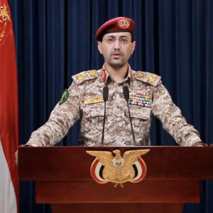 这张2月19日的视频截图显示,也门胡塞武装发言人叶海亚·萨雷亚在萨那发表声明。新华社发