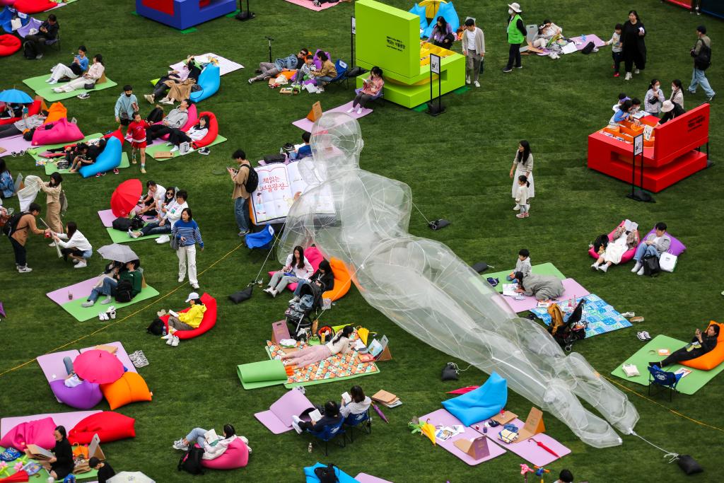 2023年4月23日,人们在韩国首尔广场上阅读和休息。新华社记者王益亮摄