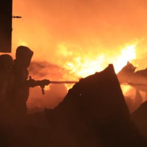 2月19日,在黎巴嫩加济耶镇,消防员在以军空袭后的火场工作。