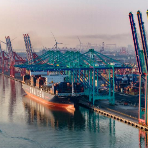 2月2日,一艘集装箱货轮停靠在天津港“智慧零碳”码头(无人机照片)。新华社记者赵子硕摄