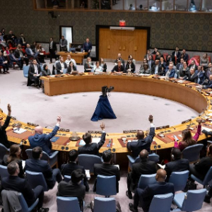 这是2月20日在位于纽约的联合国总部拍摄的安理会投票现场。联合国安理会2月20日就阿尔及利亚代表阿拉伯国家提出的要求在加沙地带立即实现人道停火的决议草案进行表决,因美国独家否决,决议草案未获通过。新华社发(联合国供图/曼努埃尔·伊莱亚斯摄)