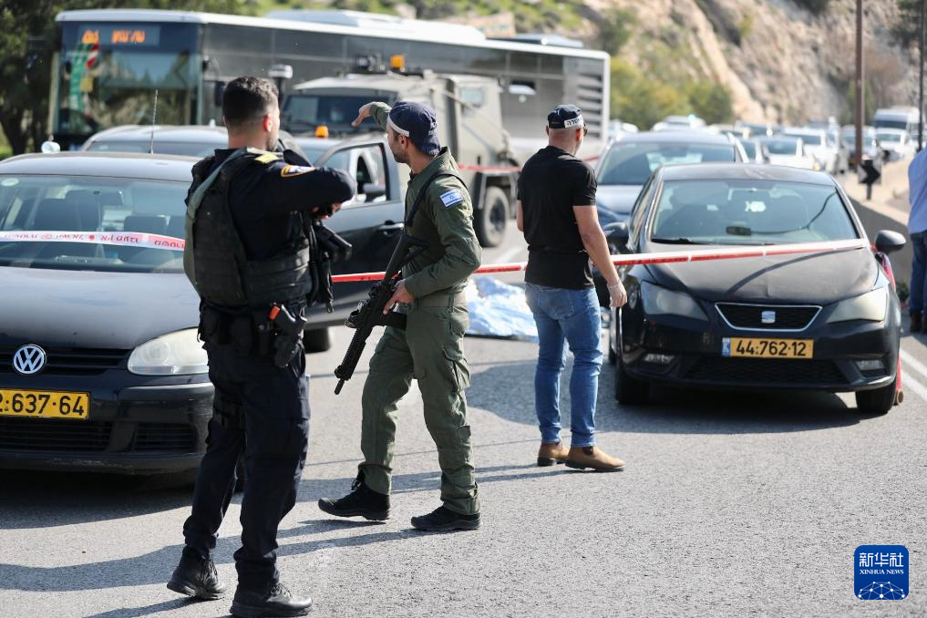 2月22日,以色列安全人员在约旦河西岸犹太人定居点马阿勒阿杜明附近的枪击事件现场警戒。