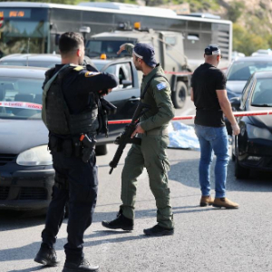 2月22日,以色列安全人员与应急人员聚集在约旦河西岸犹太人定居点马阿勒阿杜明附近的枪击事件现场。