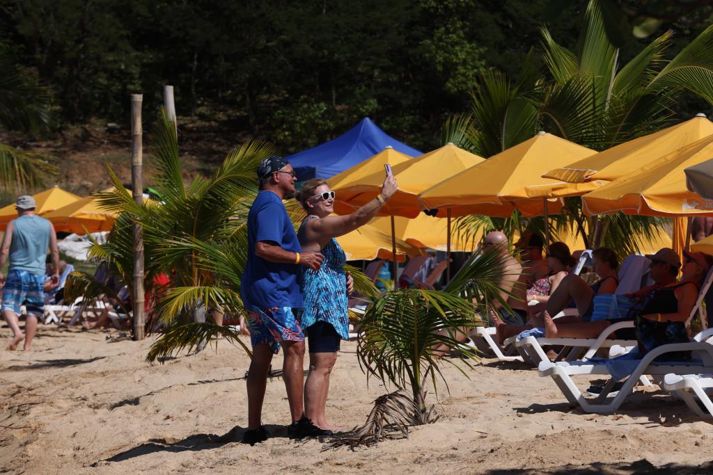 2月2日,在安提瓜和巴布达首都圣约翰西海岸一处沙滩,游人自拍合影。(新华社记者李梦馨摄)