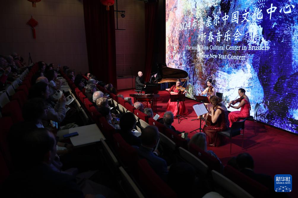 2024布鲁塞尔中国文化中心新春音乐会由来自比利时、中国、西班牙以及哈萨克斯坦的艺术家联合演出,观众们在中西乐声交织中庆祝龙年春节。