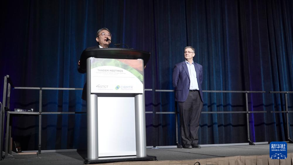 2月23日,在美国得克萨斯州圣安东尼奥举行的2024年度移植与细胞治疗会议上,黄晓军(左)领取国际血液与骨髓移植研究中心颁发的杰出服务奖后发言。新华社记者 徐剑梅 摄