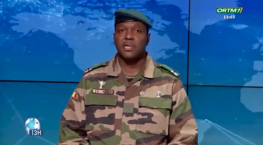 1月28日,马里过渡政府发言人阿卜杜拉耶·马伊加在国家电视台宣读联合公报(视频截图)。新华社发