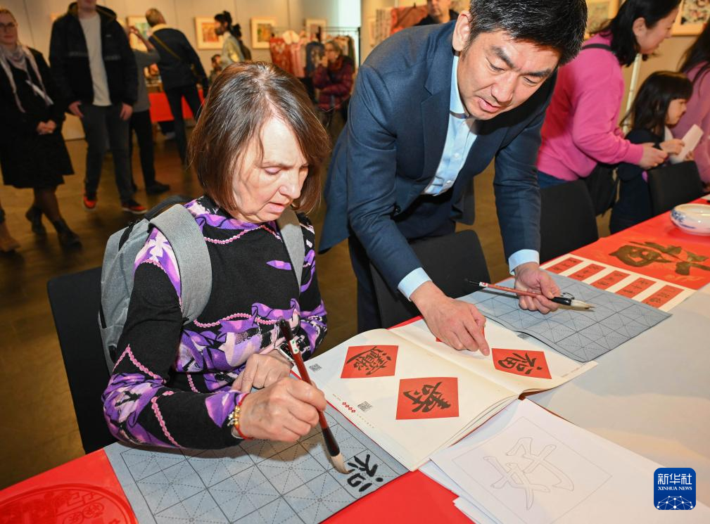 2月24日,在德国柏林中国文化中心,一名女子在工作人员指导下体验写毛笔字。