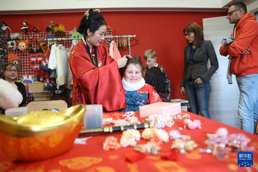 2月24日,小朋友在比利时班什举行的“金龙迎新——2024比利时生肖设计展”期间体验汉服妆造。