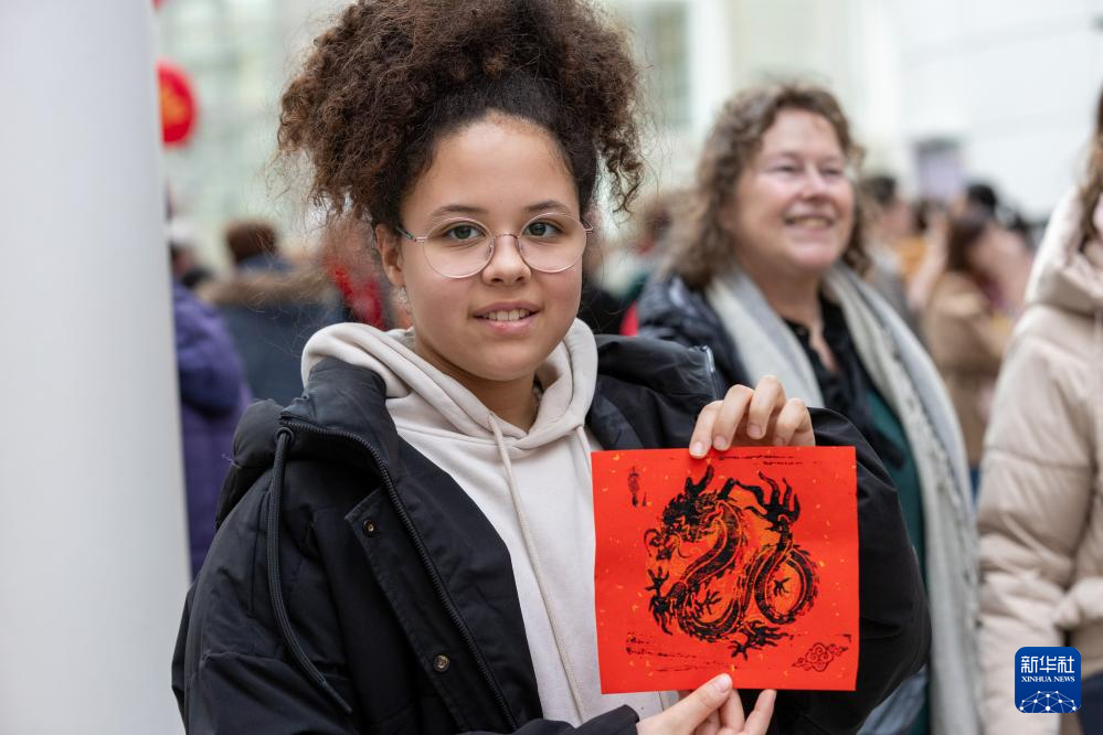 2月24日,一名观众在荷兰海牙市政厅展示龙年年画。当日,“福龙迎新春”暨元宵节庙会活动在荷兰海牙市政厅举行。