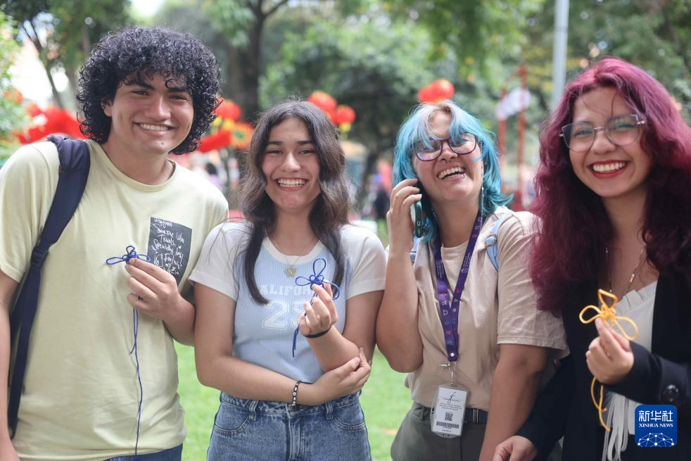 2月24日,在哥伦比亚首都波哥大,几名学习系“中国结”的年轻人一起合影。