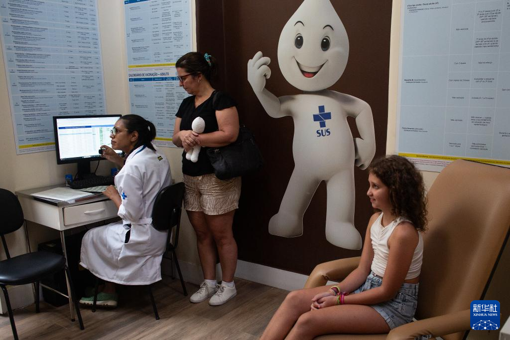 2月23日,在巴西里约热内卢博塔弗戈一家疫苗机构里,医护人员为儿童接种登革热疫苗。