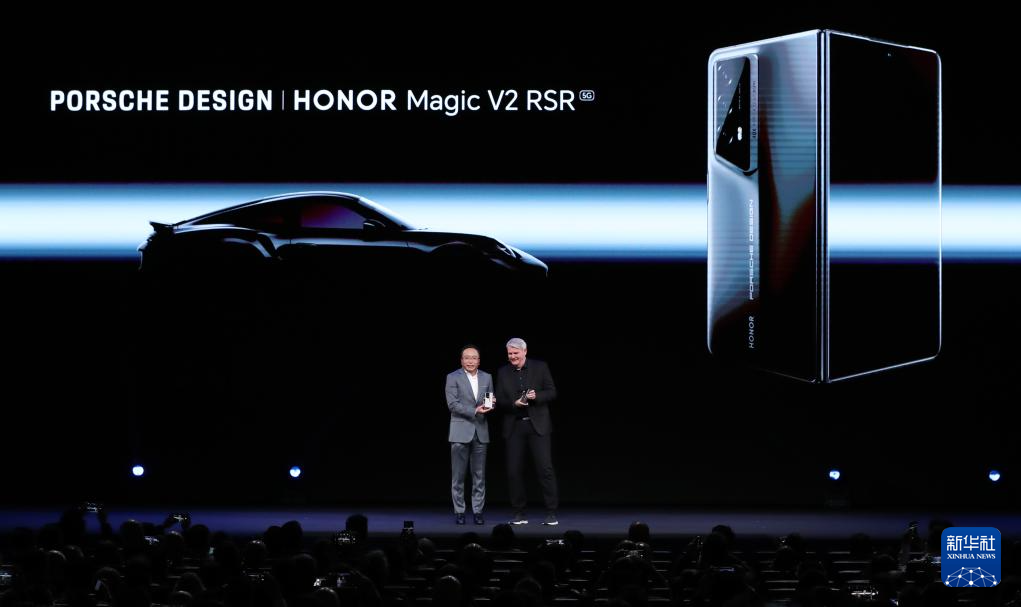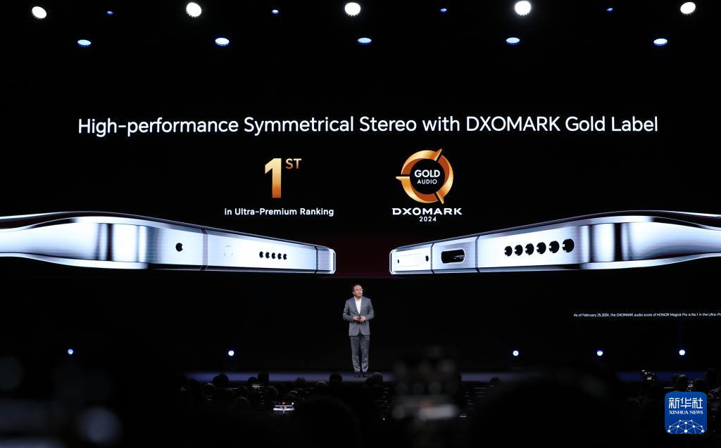 2月25日,在西班牙巴塞罗那举行的荣耀2024全球发布会上,荣耀CEO赵明(左)介绍其旗舰产品。