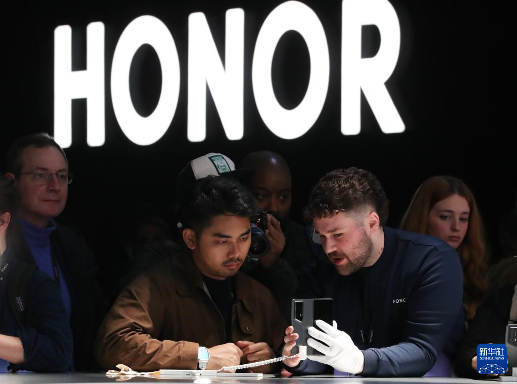 2月25日,在西班牙巴塞罗那举行的荣耀2024全球发布会后,嘉宾体验荣耀新款手机。
