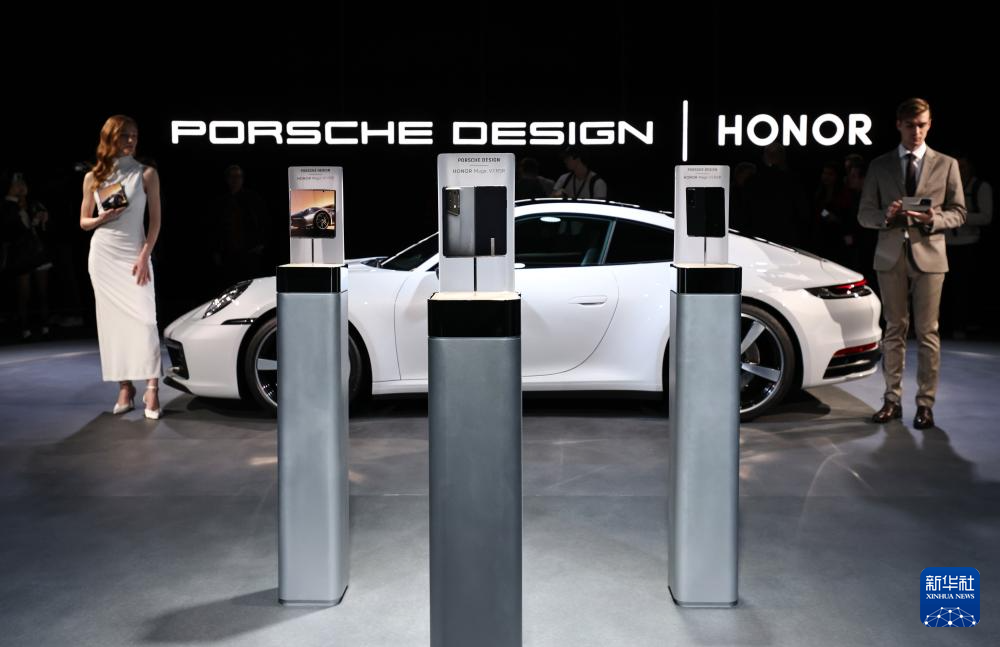 2月25日,在西班牙巴塞罗那举行的荣耀2024全球发布会后,模特展示荣耀与保时捷设计联手打造的全新旗舰手机Magic V2 RSR。