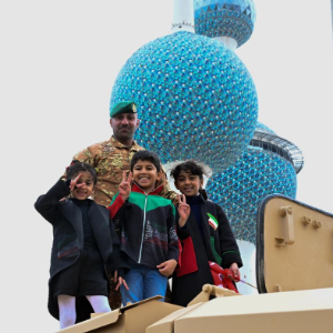 2月25日,军人在科威特首都省参加庆祝游行时与孩子合影。