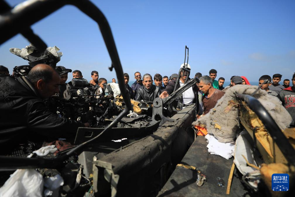 3月3日,在加沙地带中部城市代尔拜拉赫,人们查看遭以军袭击的卡车。