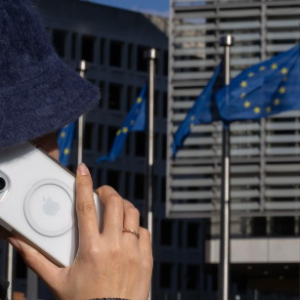 3月4日,一名女子在比利时布鲁塞尔欧盟委员会总部前使用苹果手机。