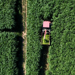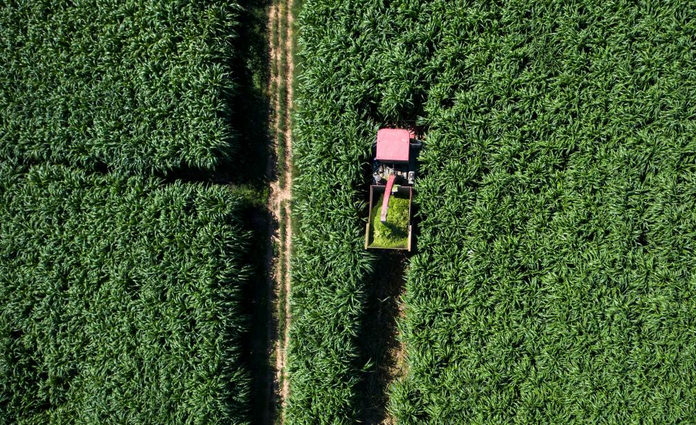 这是2022年9月6日在宁夏灵武市郝家桥镇团结村拍摄的巨菌草收割现场(无人机照片)。(新华社记者杨植森摄)