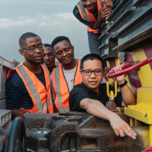 3月2日,在尼日利亚拉各斯的拉伊铁路莫博拉吉·约翰逊火车站,中方指导司机魏汝军与当地司机塞拉·阿比亚拉在驾驶室调整车辆,准备发车前往伊巴丹。