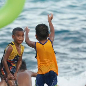 图为2024年1月17日,儿童在瑙鲁鱼市旁海滩玩耍。(新华社记者王申摄)