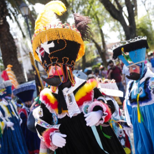 在墨西哥首都郊区小城霍奇米尔科,狂欢节游行有古老的传统。参与者穿着天鹅绒长袍、头戴面具和帽子,在街道上伴随音乐跳舞。