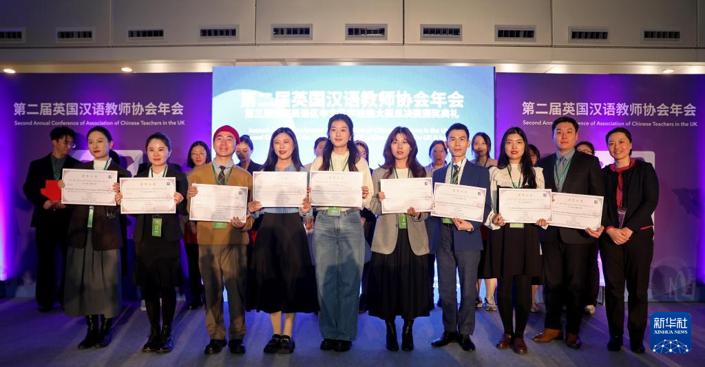 3月9日,在英国伦敦举行的第三届欧洲英语区中文教学技能大赛颁奖典礼上,获奖选手和嘉宾合影。新华社记者 李颖 摄