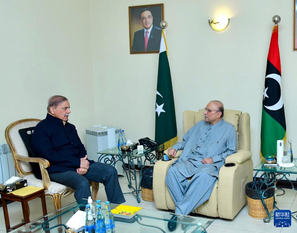 3月9日,在巴基斯坦首都伊斯兰堡,巴基斯坦总理夏巴兹·谢里夫(左)与当选总统扎尔达里会见。