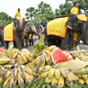 当日是泰国一年一度的大象日,芭堤雅东芭乐园在这一天为大象奉上了丰盛的水果自助餐。