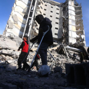 3月9日,在加沙地带南部城市拉法,巴勒斯坦人查看以军空袭后的废墟。新华社发(哈立德·奥马尔摄)