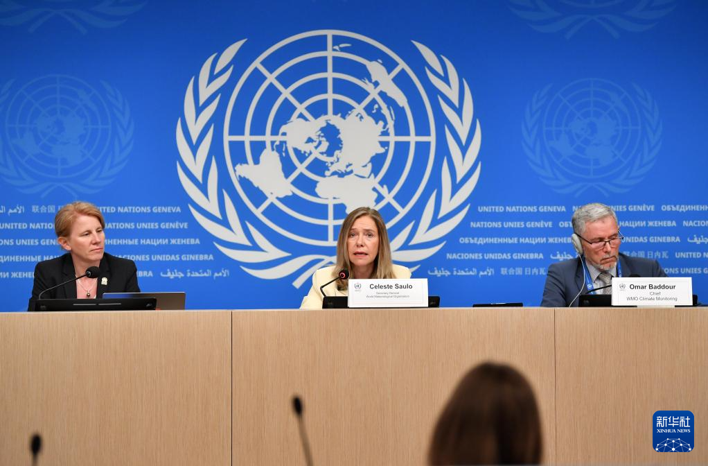 3月19日,世界气象组织秘书长塞莱丝特·绍洛(中)在瑞士日内瓦举行的新闻发布会上发言。新华社记者 连漪 摄