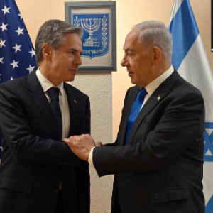 2023年10月12日,访问以色列的美国国务卿布林肯(左)在特拉维夫与以色列总理内塔尼亚胡举行会晤。新华社发(以色列新闻办公室供图)